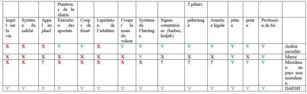 Voici une grille pour démontrer qui représente l’islam ! D’un coté les 5 piliers de l’islam et quelques préceptes de la charia et de l’autres quelques états :
